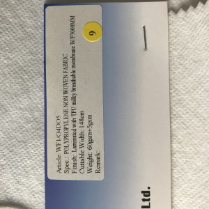 | Dokončit | Finish: Laminated with TPU milky breathable membrane W/P3000MM; Weight: 60gsm±5gsm Cuttable width: 148cm; |